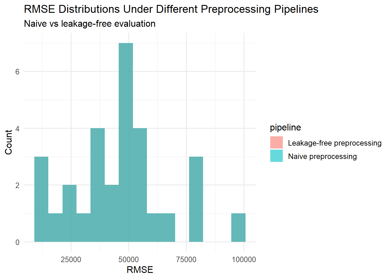 In the following section, we will repeat the same experiment using a leakage-free preprocessing pipeline. By comparing the resulting RMSE distributions, we can assess whether improper preprocessing leads to systematically optimistic or distorted performance estimates.