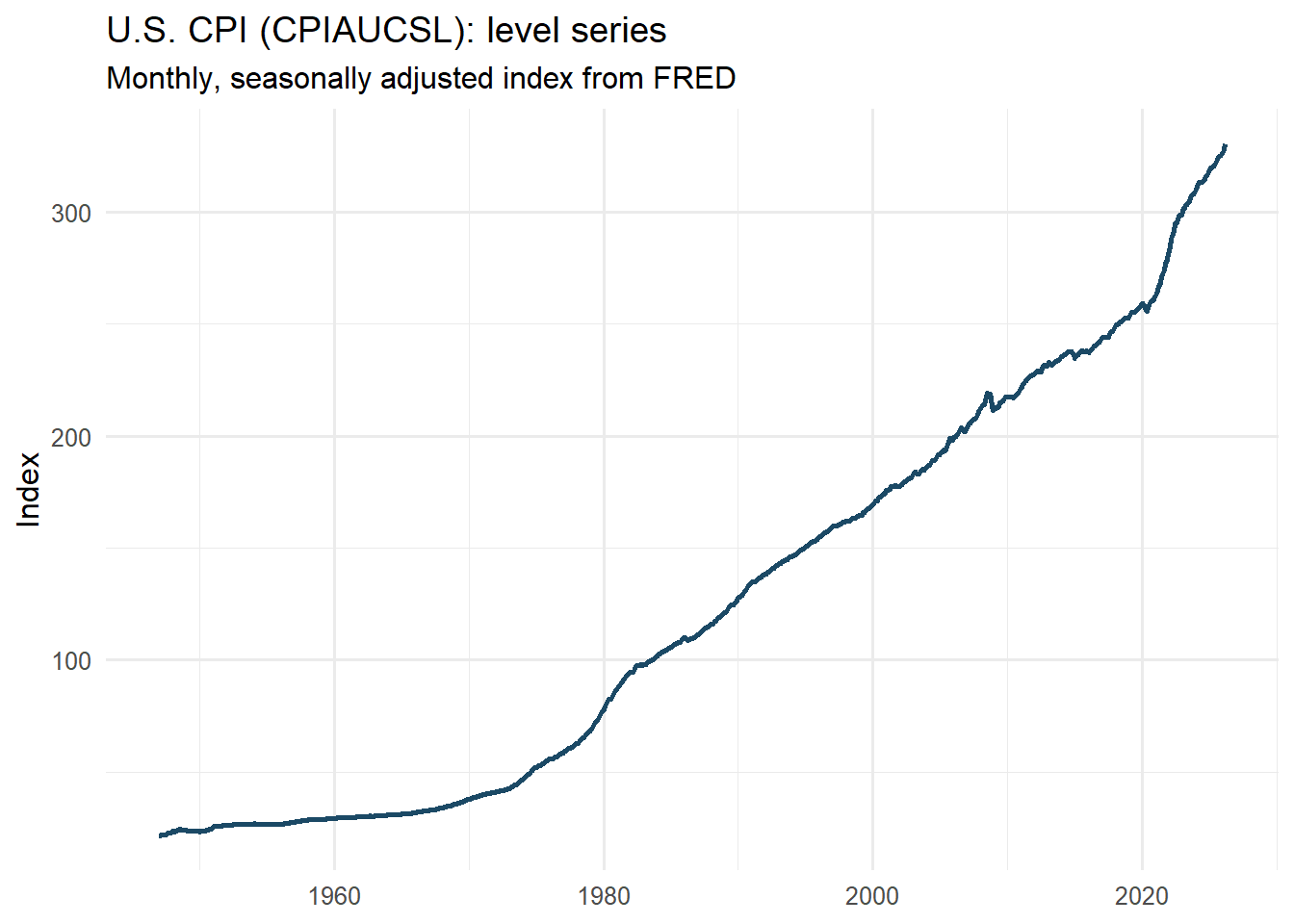 p_level <-ggplot(cpi_tbl, aes(x = date, y = cpi)) +geom_line(linewidth =0.9, color ="#1B4965") +labs(title ="U.S. CPI (CPIAUCSL): level series",subtitle ="Monthly, seasonally adjusted index from FRED",x =NULL,y ="Index" ) +scale_y_continuous(labels =label_number()) +theme_minimal(base_size =12)p_level