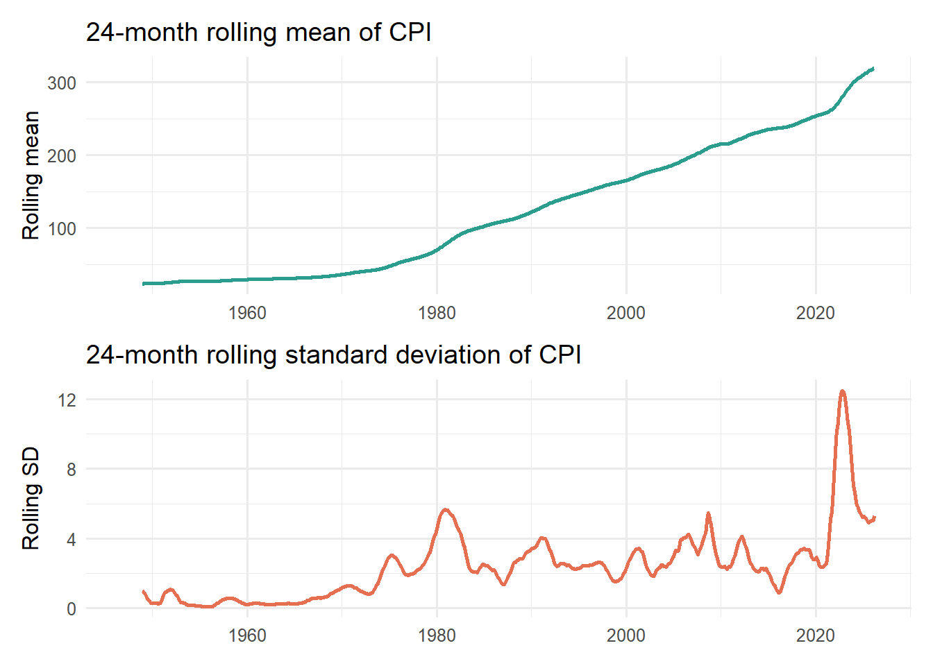 cpi_roll <- cpi_tbl %>%mutate(roll_mean_24 = zoo::rollmean(cpi, k =24, fill =NA, align ="right"),roll_sd_24 = zoo::rollapply(cpi, width =24, FUN = sd, fill =NA, align ="right") )p_roll_mean <-ggplot(cpi_roll, aes(date, roll_mean_24)) +geom_line(linewidth =0.9, color ="#2A9D8F") +labs(title ="24-month rolling mean of CPI",x =NULL,y ="Rolling mean" ) +theme_minimal(base_size =12)p_roll_sd <-ggplot(cpi_roll, aes(date, roll_sd_24)) +geom_line(linewidth =0.9, color ="#E76F51") +labs(title ="24-month rolling standard deviation of CPI",x =NULL,y ="Rolling SD" ) +theme_minimal(base_size =12)p_roll_mean / p_roll_sd