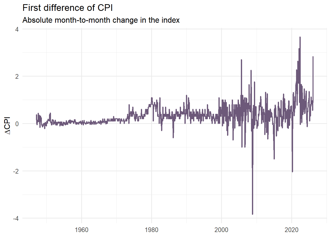 cpi_diff_tbl <- cpi_tbl %>%mutate(diff_cpi =c(NA, diff(cpi))) %>%filter(!is.na(diff_cpi))p_diff <-ggplot(cpi_diff_tbl, aes(x = date, y = diff_cpi)) +geom_line(linewidth =0.8, color ="#6D597A") +labs(title ="First difference of CPI",subtitle ="Absolute month-to-month change in the index",x =NULL,y =expression(Delta*CPI) ) +theme_minimal(base_size =12)p_diff
