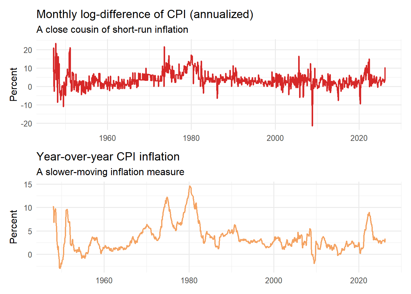 The comparison between the two plots is also instructive. The monthly log-difference captures short-term fluctuations and reacts quickly to shocks, while the year-over-year inflation series smooths out this noise and highlights longer-term inflation dynamics. Both are useful, but they answer different questions.